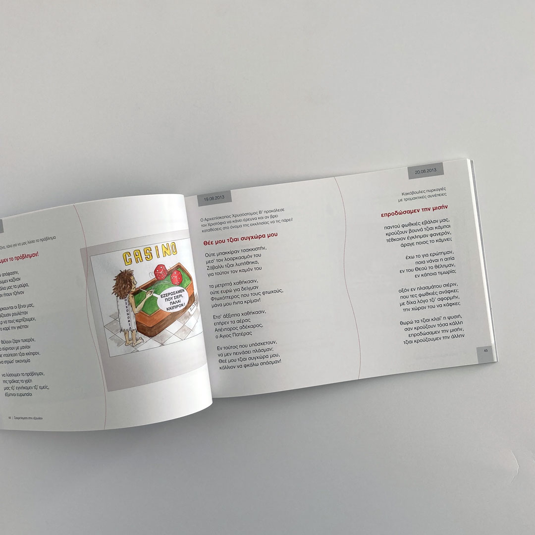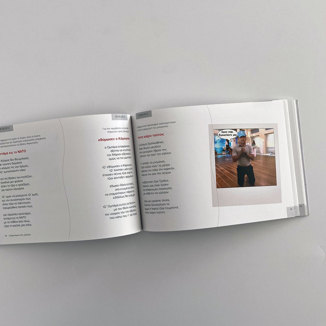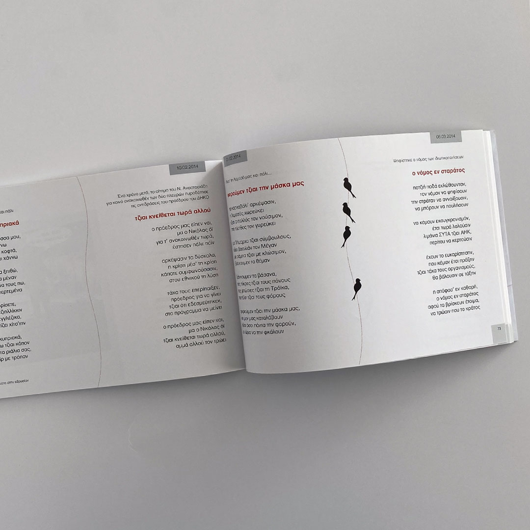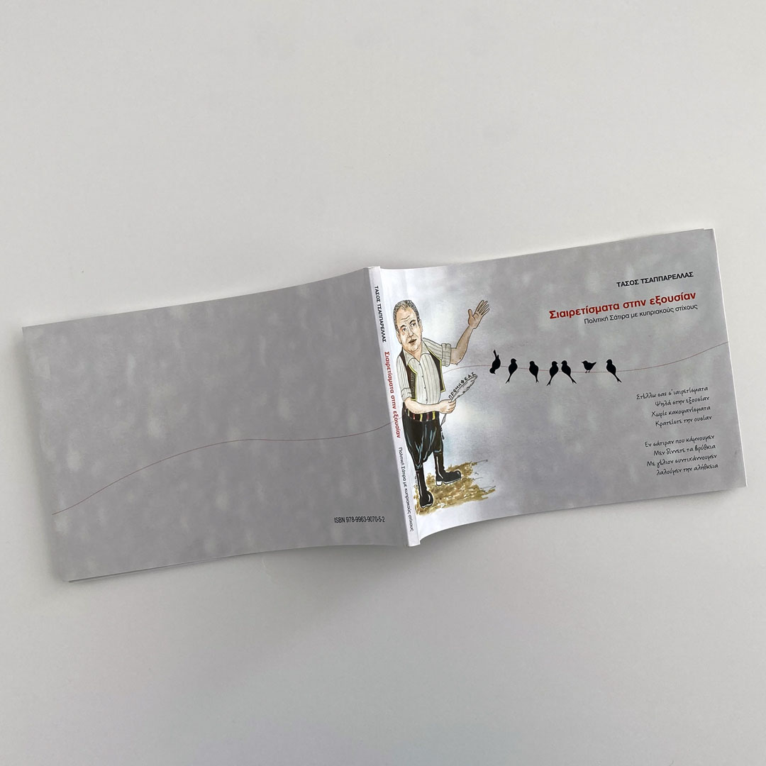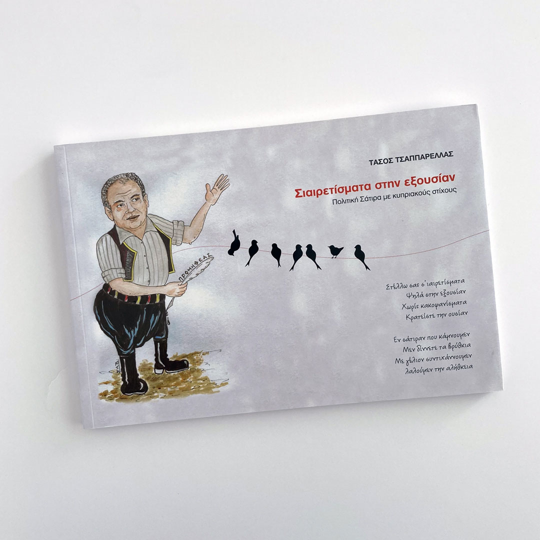It features a minimalist yet striking cover that captures attention through its use of caricature art and symbolic imagery. The illustration on the cover depicts the author, who is standing with one hand raised as if addressing an audience. The figure's attire and stance suggest a humorous or satirical tone, which is reinforced by the title of the book, "Σιαιρετίσματα στην εξουσίαν", indicating a political satire. The central image also includes a line of birds sitting on a wire, with one of the birds holding a slingshot, aiming it at the man. This adds a layer of irony and critique, possibly suggesting the idea of resistance or rebellion against authority, aligning with the book's theme of political satire. The design uses a limited color palette, primarily neutral tones with touches of red for emphasis on the title, drawing the viewer's focus. The text is clean and modern, ensuring readability while allowing the illustration to take center stage.