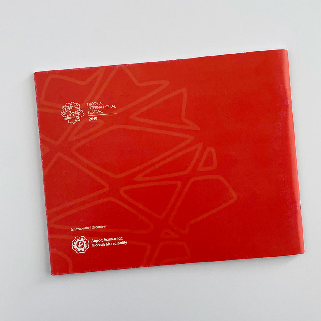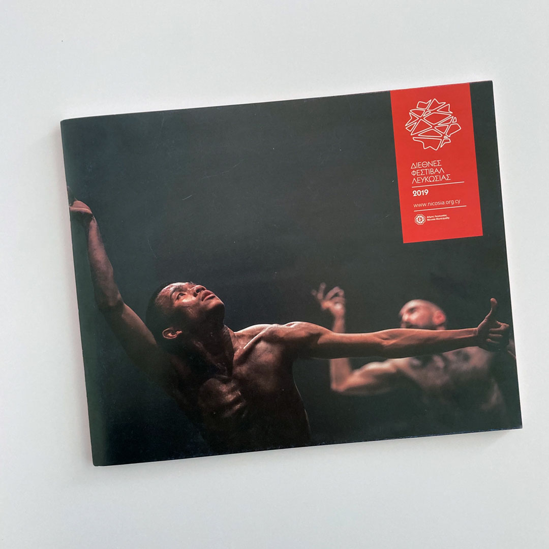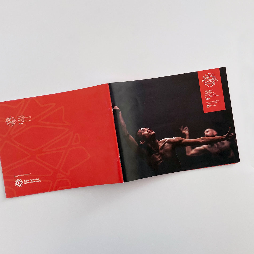 This catalog was designed for the *Nicosia International Festival 2019*, capturing the essence and spirit of the event through its visual elements. The cover features a bold, vibrant red, symbolizing the energy and passion that the festival embodies. The intricate, abstract pattern on the front subtly reflects the interconnectedness and diversity of the performances showcased at the festival. The interior layout is designed to provide a balance between striking imagery and accessible information. The right-hand page, for example, showcases a powerful image of performers in action, giving a glimpse into the dynamic nature of the festival's performances. The dark background enhances the focus on the performers, while the minimal use of text ensures that the visual impact remains strong. The catalog effectively communicates the festival’s brand identity, with consistent use of the festival’s logo and color scheme throughout. Each section of the catalog is thoughtfully designed to guide the reader through the content in an engaging and aesthetically pleasing manner, ensuring that the festival’s artistic vision is conveyed clearly and memorably.