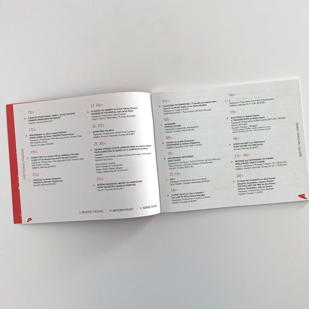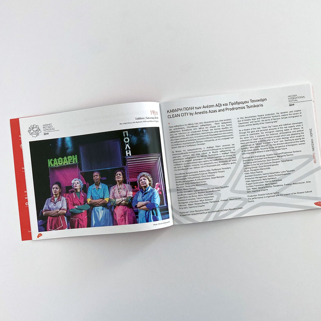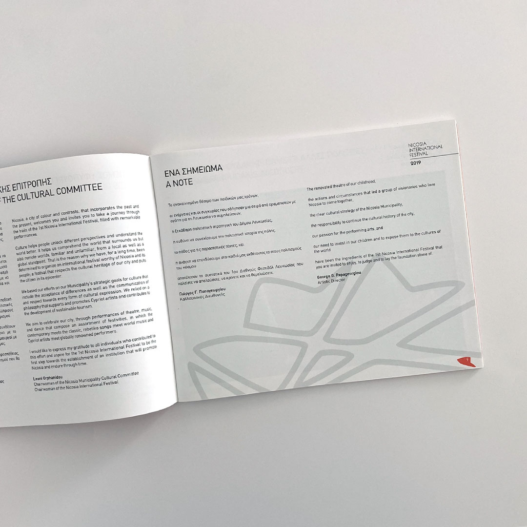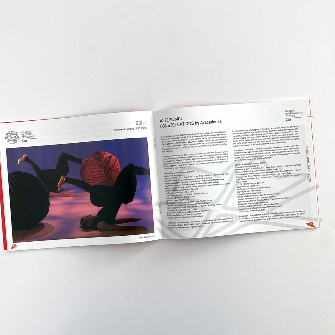 This catalog was designed for the *Nicosia International Festival 2019*, capturing the essence and spirit of the event through its visual elements. The cover features a bold, vibrant red, symbolizing the energy and passion that the festival embodies. The intricate, abstract pattern on the front subtly reflects the interconnectedness and diversity of the performances showcased at the festival. The interior layout is designed to provide a balance between striking imagery and accessible information. The right-hand page, for example, showcases a powerful image of performers in action, giving a glimpse into the dynamic nature of the festival's performances. The dark background enhances the focus on the performers, while the minimal use of text ensures that the visual impact remains strong. The catalog effectively communicates the festival’s brand identity, with consistent use of the festival’s logo and color scheme throughout. Each section of the catalog is thoughtfully designed to guide the reader through the content in an engaging and aesthetically pleasing manner, ensuring that the festival’s artistic vision is conveyed clearly and memorably.